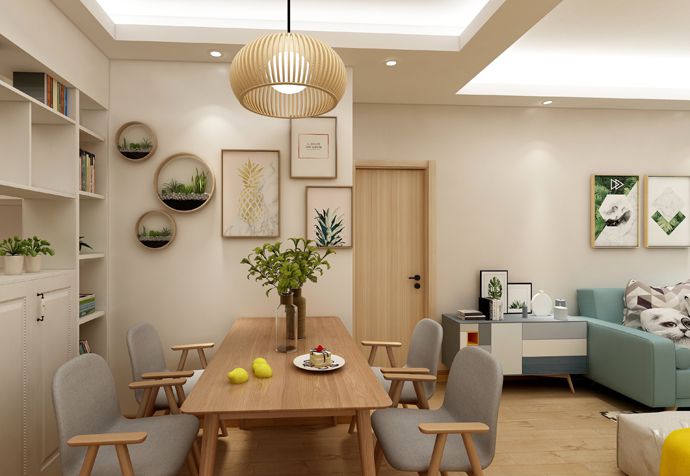 餐厅空间,与客厅贯通,保留了原有的层高,灯具均采用明装形式,复古石膏造型叠级与客厅造型整体设计,形成一体;我们将靠南侧的一面墙取消,设置了一个餐边柜,这样在不占用餐厅空间的前提下,增加了餐厅的操作与储藏空间。